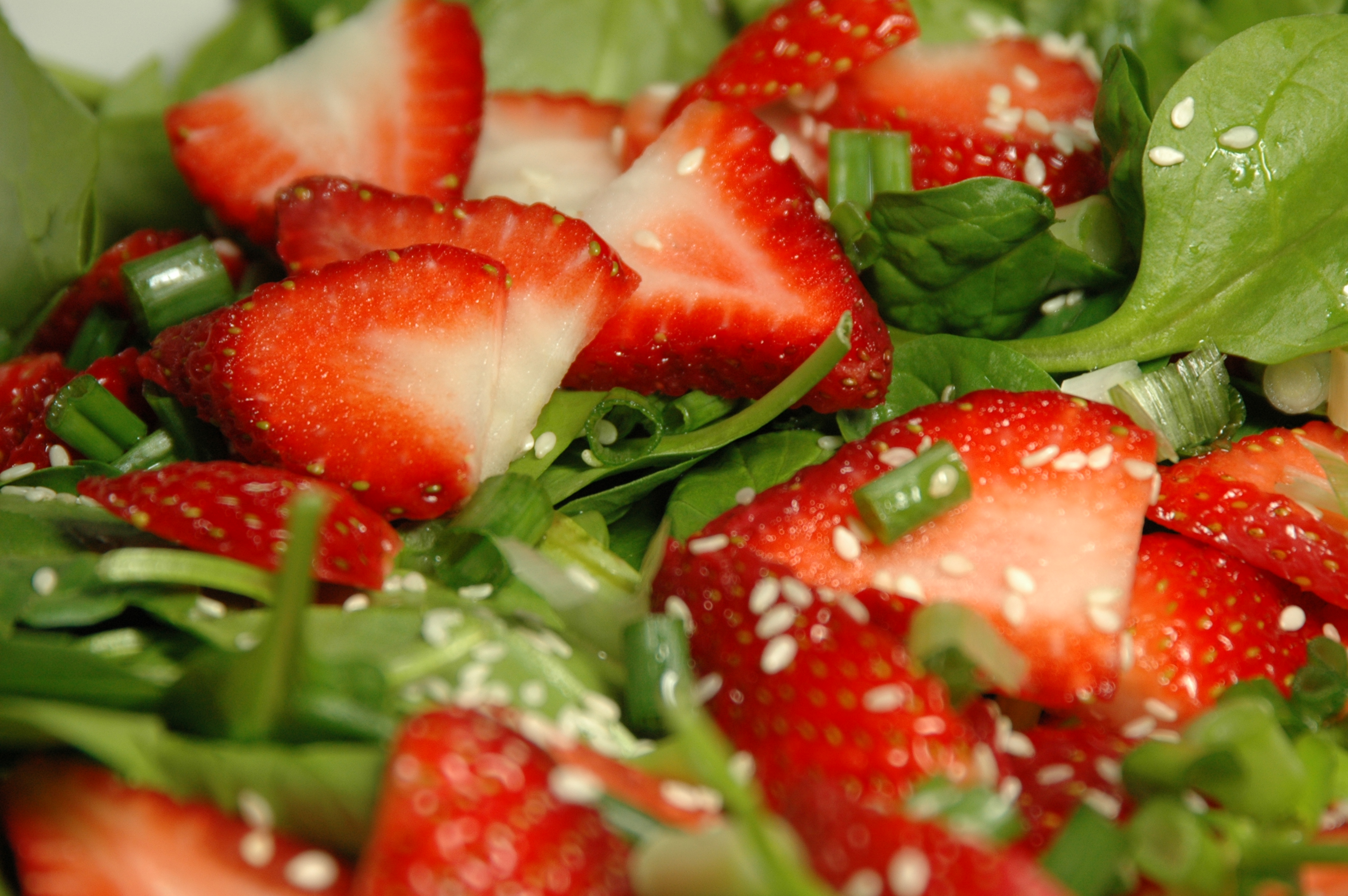 1. Add spinach, strawberries and sesame seeds to a large bowl.