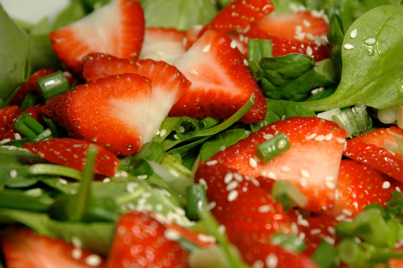 1. Add spinach, strawberries and sesame seeds to a large bowl.